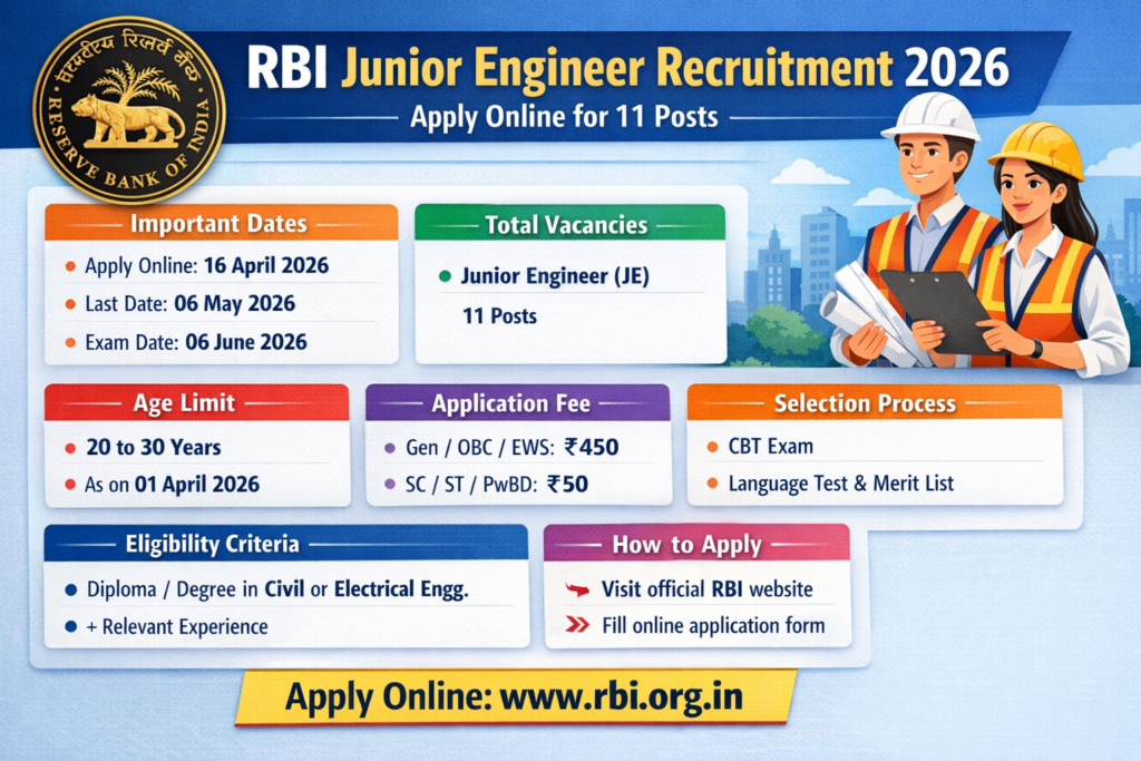 The Reserve Bank of India (RBI) has officially released a notification for the recruitment of Junior Engineer (JE) posts. A total of 11 vacancies are available under this recruitment. Interested candidates can apply online from 16 April 2026 to 06 May 2026.